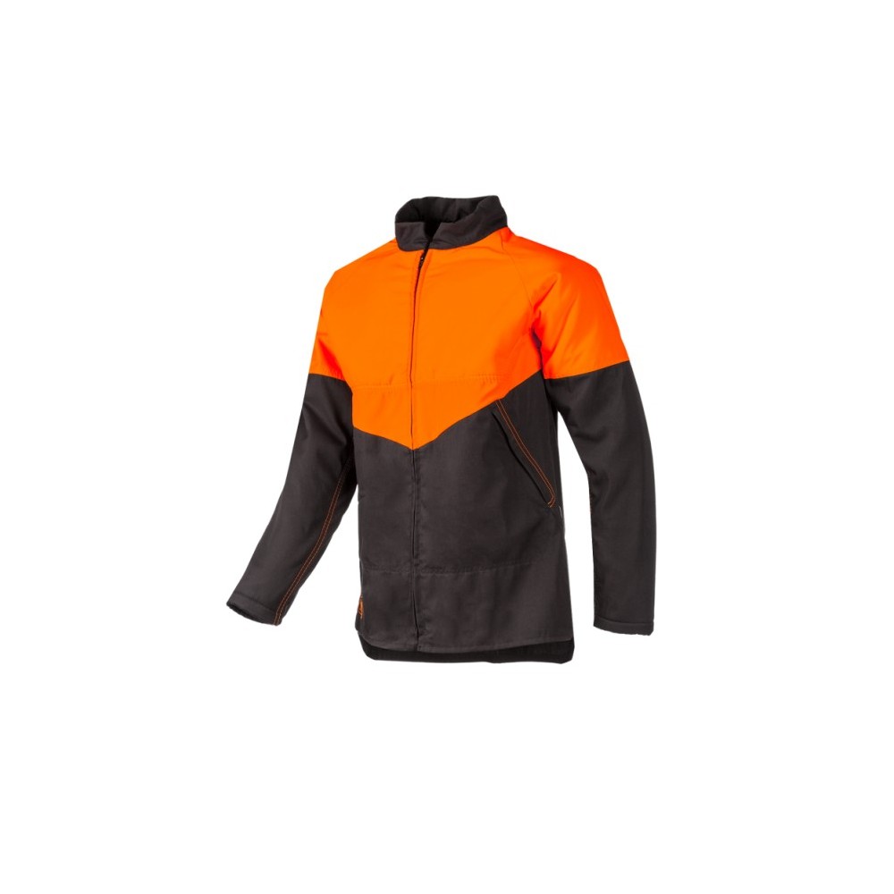 Švarkas iš kokybiško šiuolaikiško tvirto audinio, kuris suteikia reikalingą apsaugą ir išskirtinį komfortą miško ruošimo metu. Tiesus siluetas, trumpa paaukštinta apykaklė. Nugarinė dalis prailginta, su ventiliacinėmis angomis. Viršutinė dalis – ryškios signalinės spalvos padidina matomumą, lengvai atskiriama tarp žalumos.  Apačia – tamsiai pilkos spalvos. Rankogaliai  susiaurinami spaudėmis. Šonuose - užsegamos paslėptu užtrauktuku kišenės.Švarkas užsegamas paslėptu užtrauktu.Rankų, pečių ir krūtinės srityse - 8 sluoksnių apsauga pagal  EN 381-11 reikalavimus.SIP apsauga.
